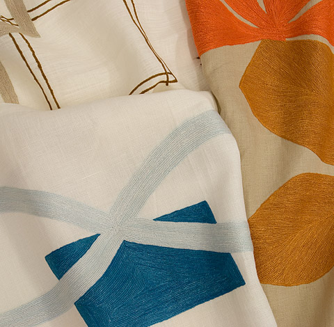 Worked in fine rayon threads on a linen ground, Judy Ross’s hand-embroidered designs impart a luxurious finish. Precisely drawn motifs exemplify Judy’s sophisticated handling of color and texture.