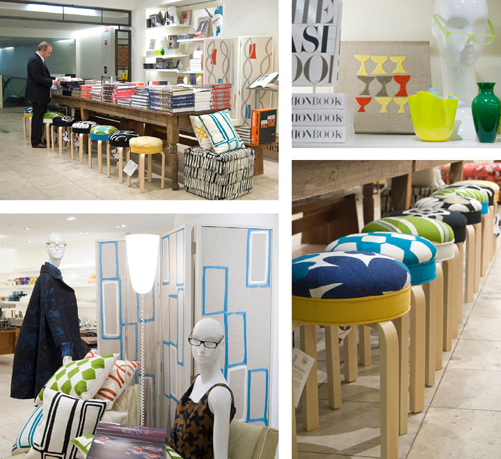 For the month of June 2008, Judy Ross teamed up with Barneys for a pop-up shop called "Swing Shop." Judy Ross Textiles showed a line of folding screens, artwork panels, upholstered cubes and brightly colored floor pillows. Judy also collaborated with Artek and introduced a limited edition collection of the iconic Alvar Aalto stool upholstered in Judy Ross Textiles' hand embroidered chain stitch designs.