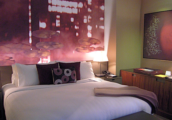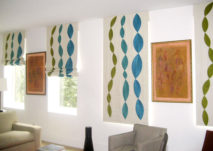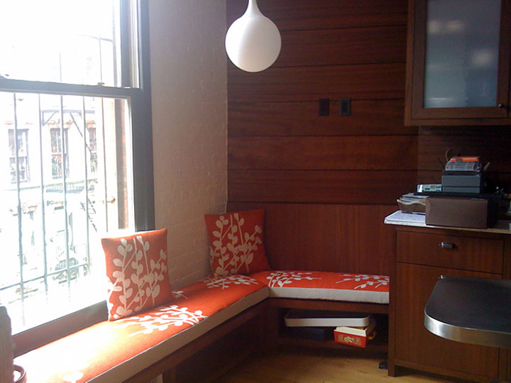 For a loft in Chelsea, Judy Ross Textiles designed and produced an upholstered banquette and pillows for architect Tom Sansone. Judy used the Spray design for this project.