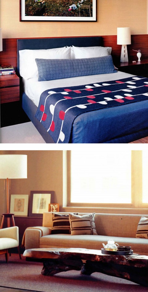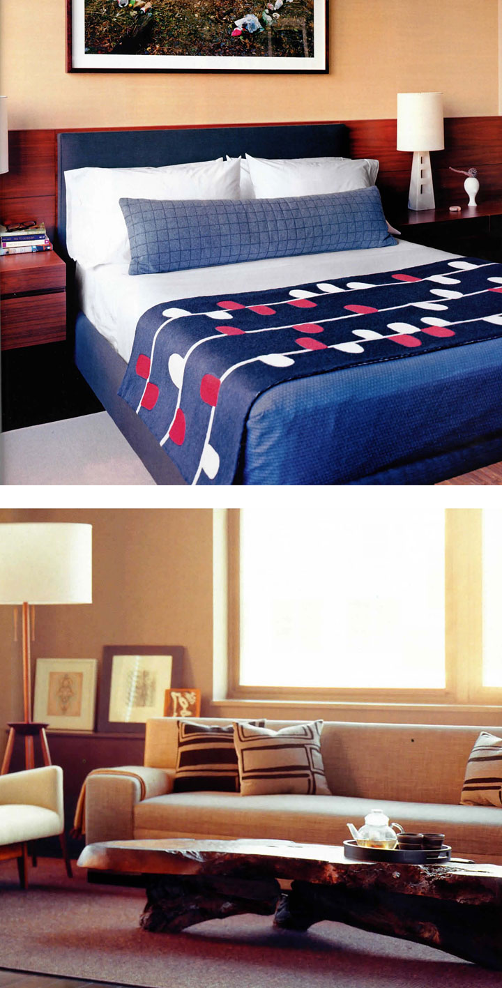 For the New York apartment that designer Shamir Shah shares with artist Malcolm Hill, Judy Ross Textiles embroidered custom-colored pillows in the Procession pattern and a Calendar bed cover.