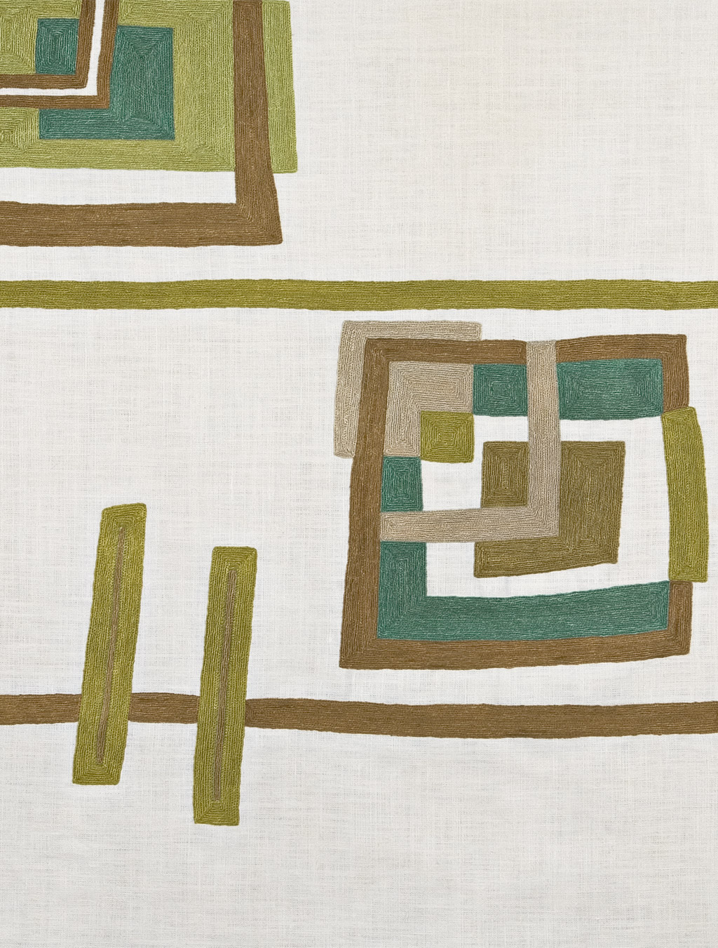 Linen fabric with hand-embroidered motifs in a fine rayon thread. Embroidered yardage can be made into bedcovers, curtain panels, or sewn to your specifications. Fabric is available in running yardage, 56 inches in width. Lead time depends on yardage.