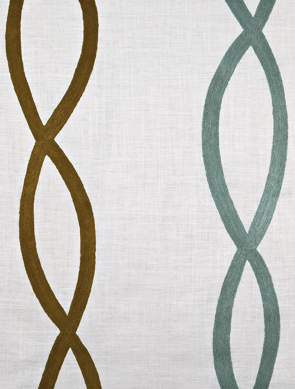 Linen fabric with hand-embroidered motifs in a fine rayon thread. Embroidered yardage can be made into bedcovers, curtain panels, or sewn to your specifications. Fabric is available in running yardage, 56 inches in width. Lead time depends on yardage.