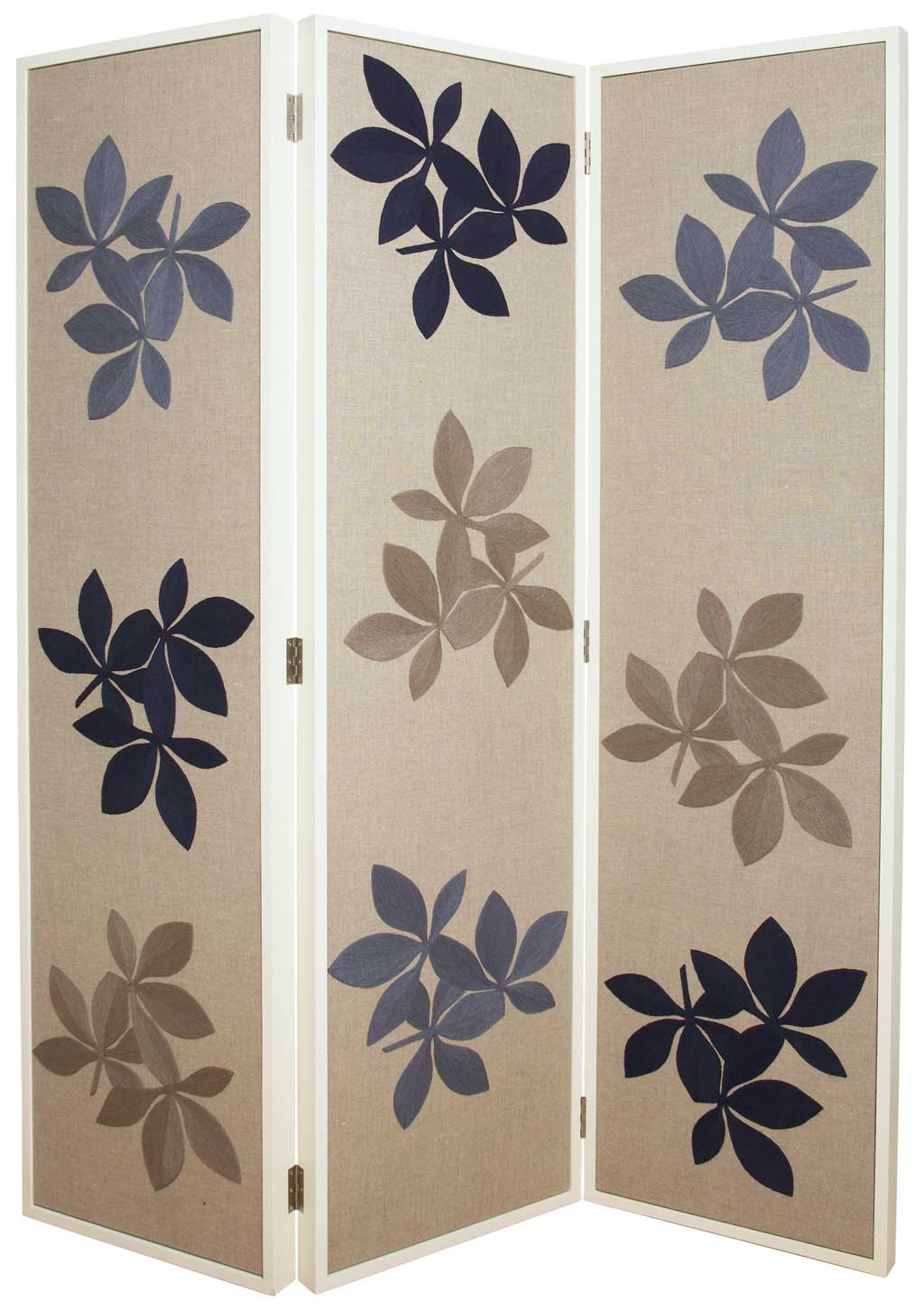 The front of this three-paneled folding screen features hand-embroidered linen on a sustainably harvested, handmade, solid maple frame with a hand-rubbed grey finish. The back is finished in linen. Contact the studio to inquire about custom options.