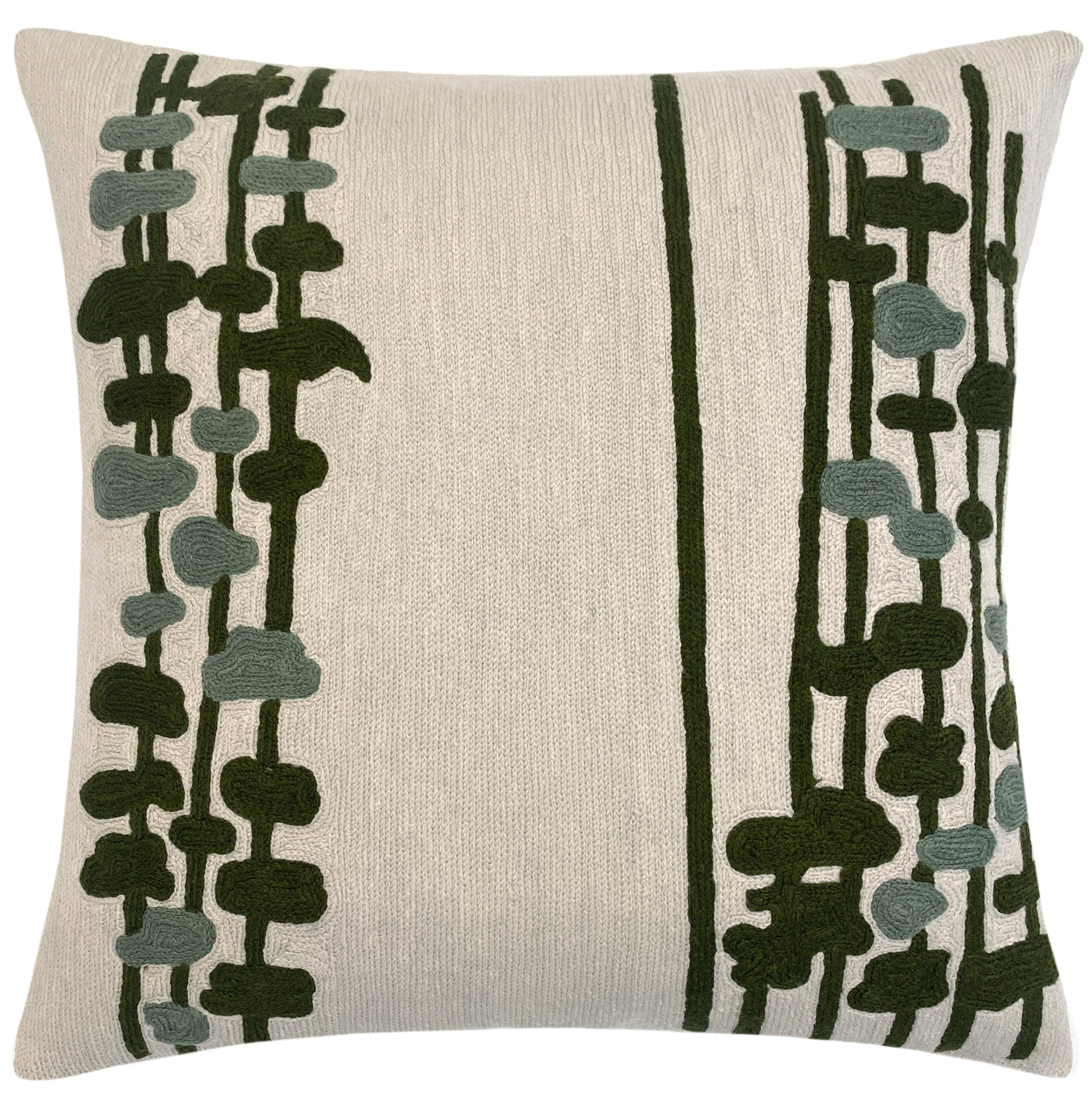 Hand embroidered by our artisans, these pillows use the finest, hand-dyed New Zealand wool, with a cotton canvas overlay backing and a 5/95 down/feather insert.