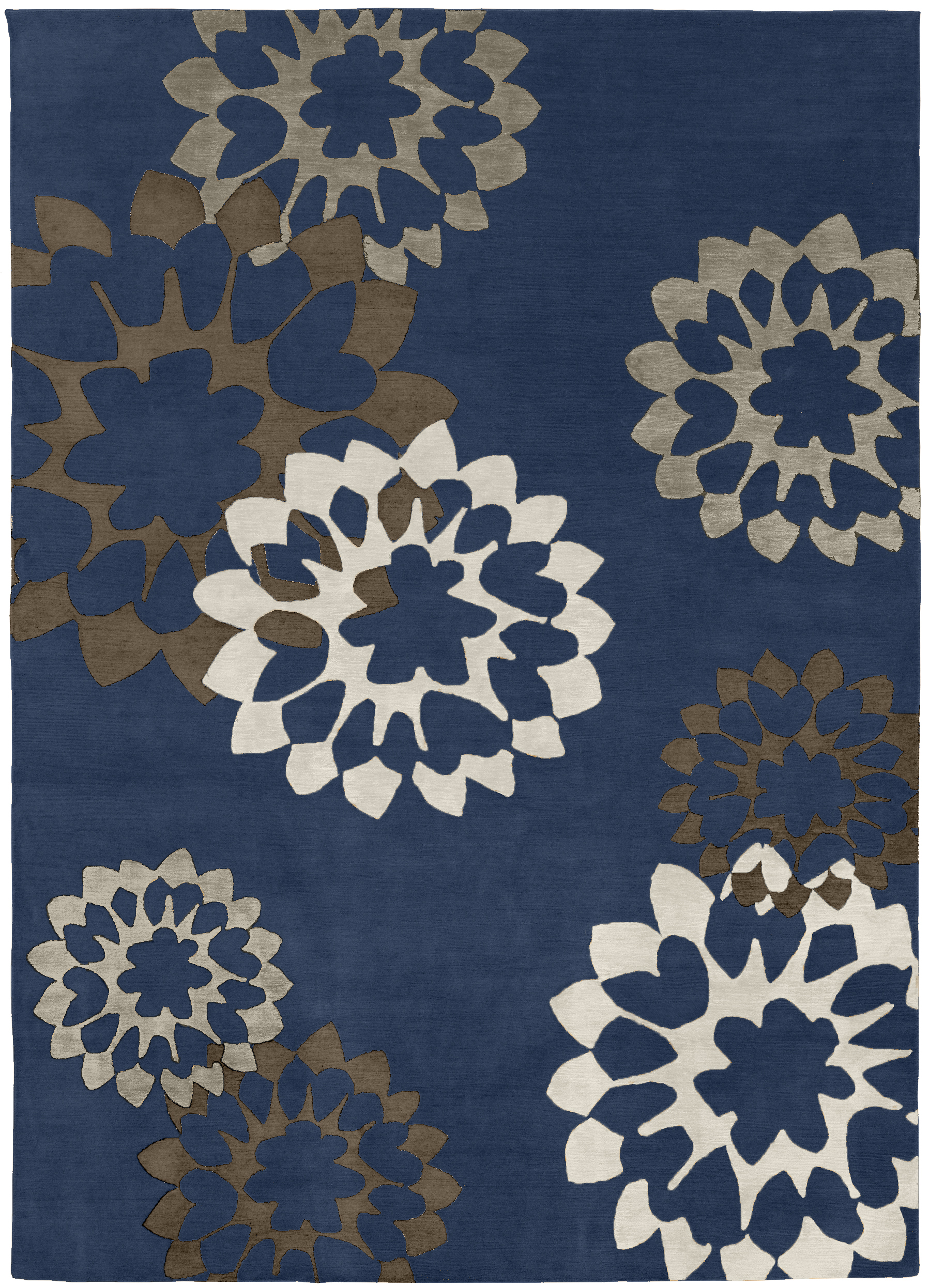 Our rugs are made to order in two different techniques: chain stitch hand embroidery or hand-knotted at 100 knots per inch, which is shown here. Click here for more information.