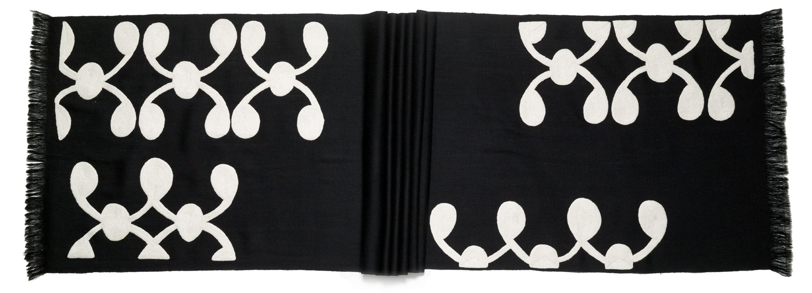 This limited edition scarf is hand embroidered with rayon yarn on soft, lightweight wool and has a one-inch fringe on each end.